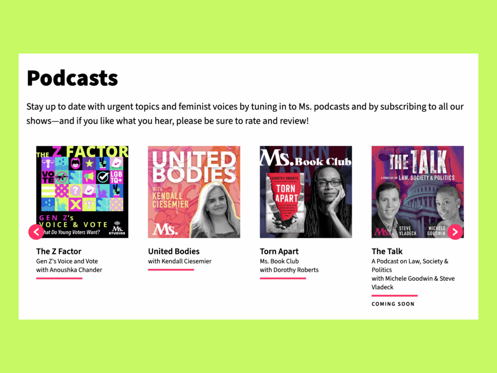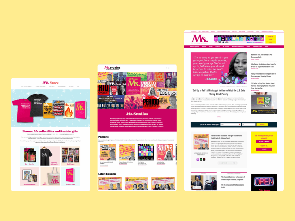 Ms. Magazine now has some of the most successful and highly-rated podcasts in the market, and an increased capacity to feature and spotlight content in line with the news cycle on their website. Their pageviews are up, their load time is down, and their content output is at an all-time high due in large part to the platform we’ve built that streamlines their editorial processes.