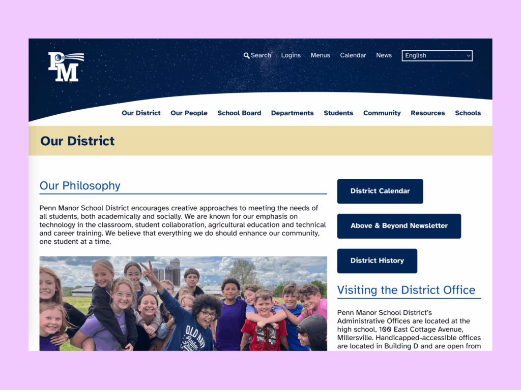 Our goal was to create a modern, responsive theme for the district’s use that visually differentiated between the district and high school, but reflected that both websites were part of the same Penn Manor family.