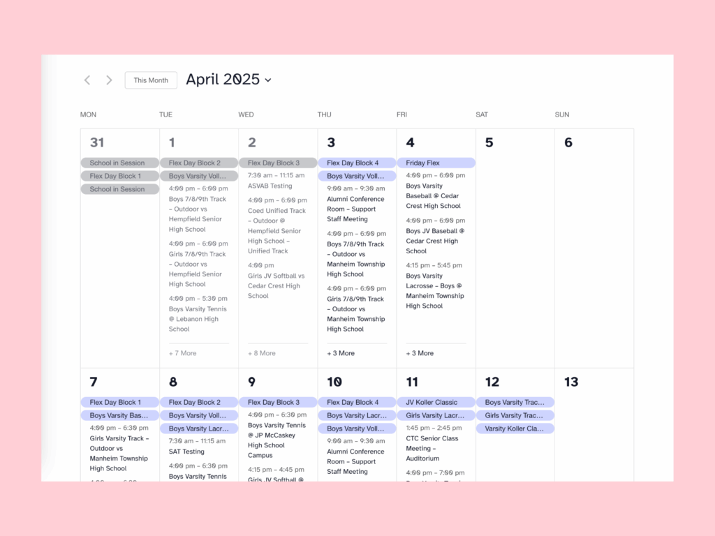 We integrated multiple external district calendars, including an athletics schedule, the lunch menu, and the general calendar, to make updates, edits, and adding new events easier on the back-end. On the District site, we built an integration with AppPresser.